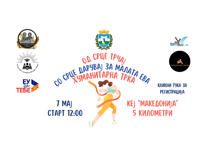 На 7 мај 2026 година (четврток), со почеток во 12:00 часот, СОСУ „Св. Кирил и Методиј“ – Охрид, во соработка со ЈП „Билјанини извори“ – Охрид, организира хуманитарна трка под мотото „Од срце трчај – со срце дарувај за малата Ева“.