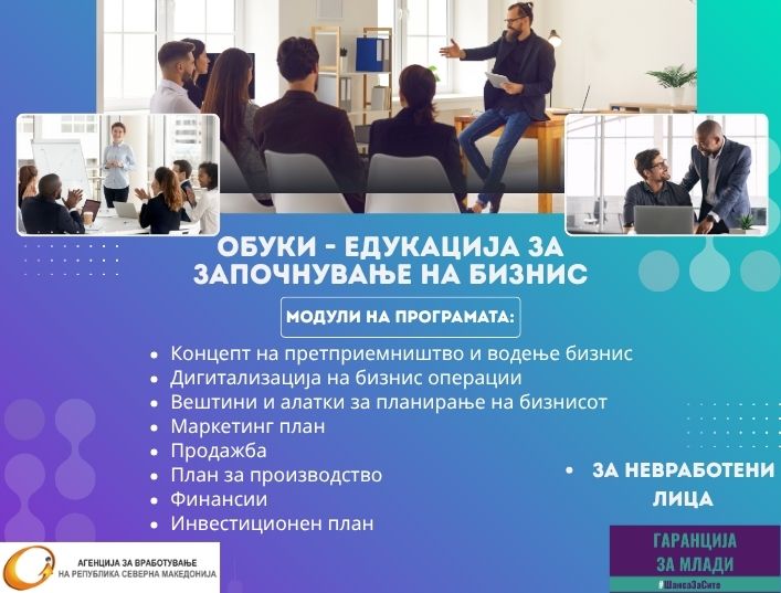 Агенцијата за вработување на Република Северна Македонија ги повикува евидентираните невработени лица кои се заинтересирани да развијат свои претприемачки способности и знаења, да се пријават за учество во програмата на обуки за претприемништво, бизнис планирање и развој на бизнис вештини.